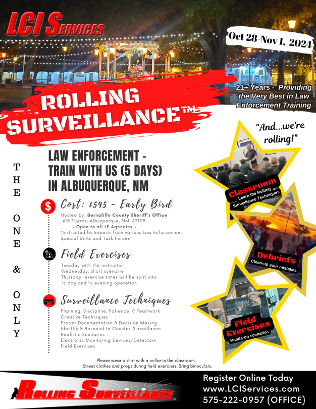 Albuquerque, NM OCT 2024 Rolling Surveillance Flyer January 22, 2024 1545 × 2000 Albuquerque, NM OCT 2024 Rolling Surveillance Flyer Share or Save: Print (Opens in new window) Print Share on LinkedIn (Opens in new window) LinkedIn Share on Facebook (Opens in new window) Facebook Share on X (Opens in new window) X Email a link to a friend (Opens in new window) Email Like Loading...