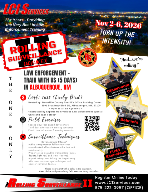 Rolling Surveillance® II – Advanced Law Enforcement Training in Albuquerque, NM – Nov 2-6, 2026. $635.00 Early Bird Payment – when payment is received by October 5th, 2026. $665.00 thereafter.