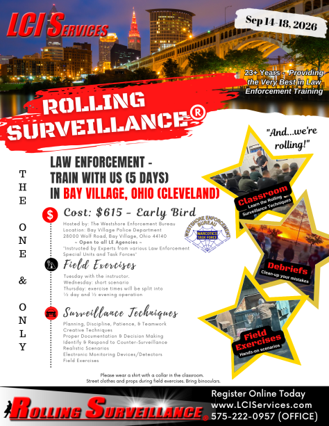 Register and/or pay below for the September 14-18, 2026, Rolling Surveillance law enforcement training in Bay Village, Ohio (Cleveland region).