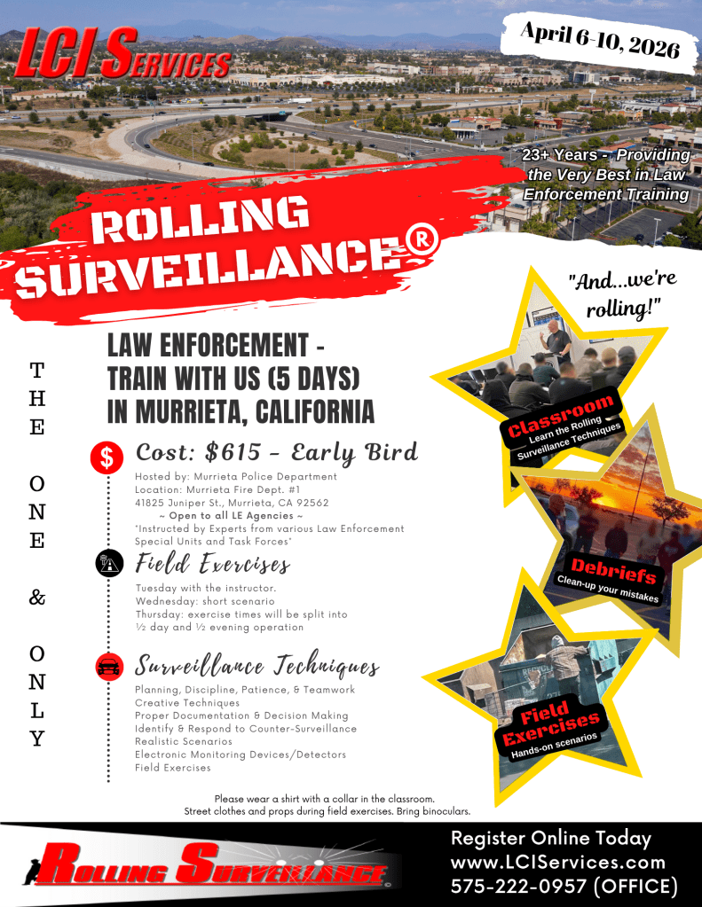 Register and/or pay below for the April 6-10, 2026, Rolling Surveillance law enforcement training in Murrieta, CA.