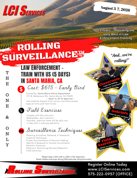 Register below for the August 3-7, 2026, Rolling Surveillance® law enforcement training in Santa Maria, CA. (Central Coast)