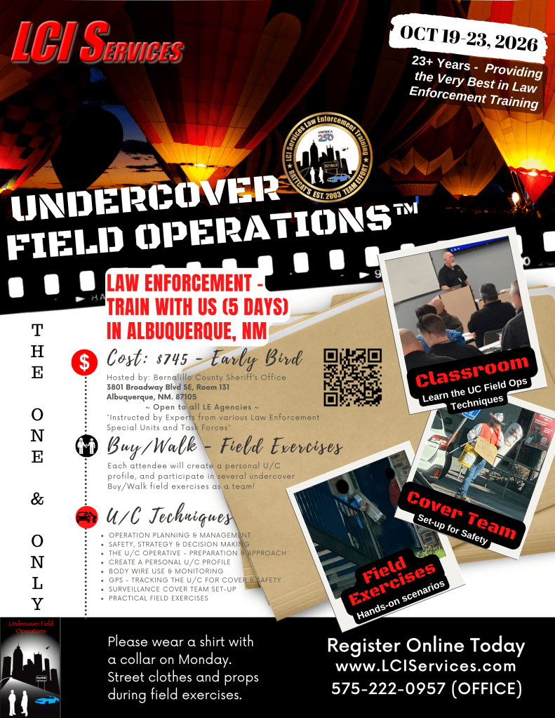 Undercover Field Operations Law Enforcement Training in Albuquerque, NM from October 19-23, 2026. $745 Early Bird Payment – when payment received by Sep 21st, 2026. $775.00 thereafter.